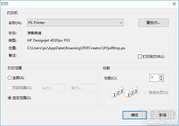7、点击打印弹出软件文件打印弹框,点击选择设置打印机设备,设置文件打印范围和份数,最后点击确定即可成功设置打印